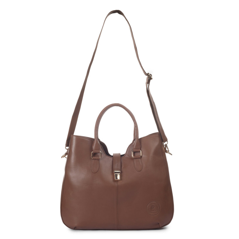 Style: Elegant structured satchel silhouette, smooth brown leather-style finish