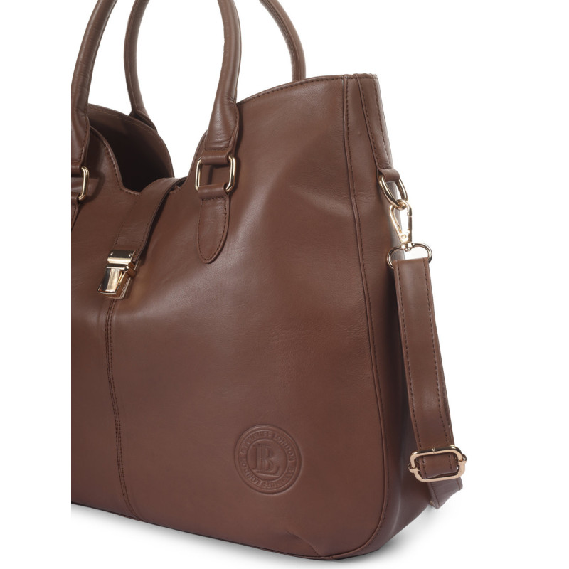 Crafted from smooth premium leather, the Kensington Lock Satchel by Bannhuff London is a refined everyday handbag designed with elegance and practicality in mind. Crafted in a rich classic brown finish, this structured satchel features sleek top handles and a polished front lock detail that adds a touch of modern luxury. Its spacious interior offers ample room for daily essentials, while the detachable shoulder strap provides versatile carrying options. Whether for work, travel, or casual outings, the Kensington Lock Satchel effortlessly blends style with functionality.