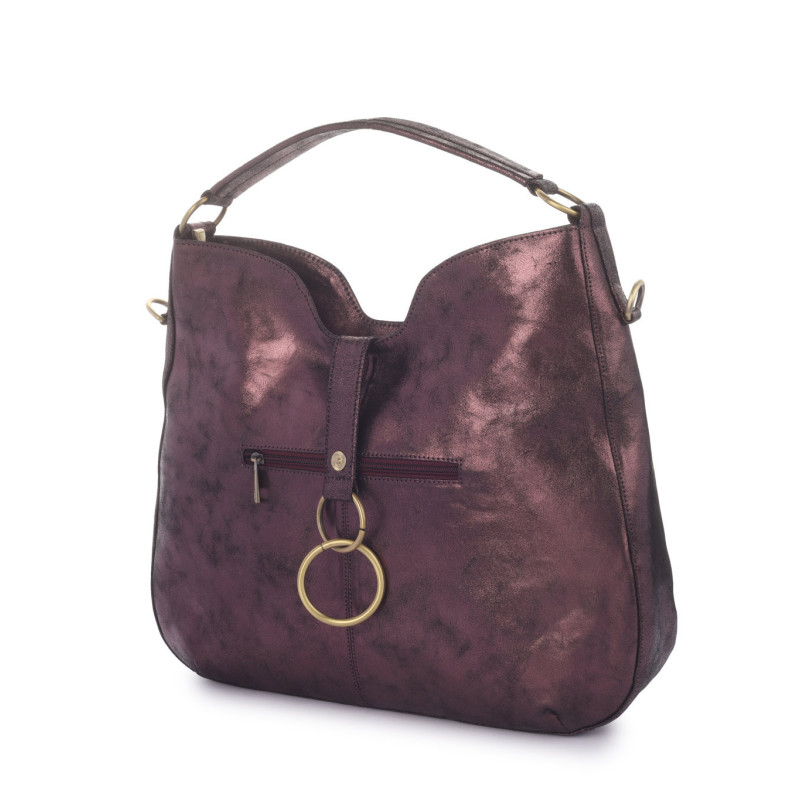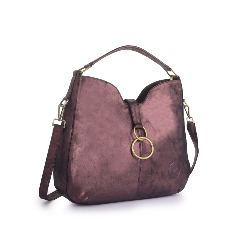 Crafted from smooth premium leather the Velvet Ember Ring Hobo by Bannhuff London is designed to make a sophisticated statement. Crafted in a rich metallic burgundy finish, this handbag blends modern glamour with everyday practicality. Its relaxed hobo silhouette offers a soft, stylish structure, while the signature double-ring hardware at the front adds a distinctive design element. The spacious interior easily accommodates daily essentials, and the adjustable crossbody strap provides versatile carrying options. Perfect for day-to-night styling, this bag brings refined luxury to any wardrobe.