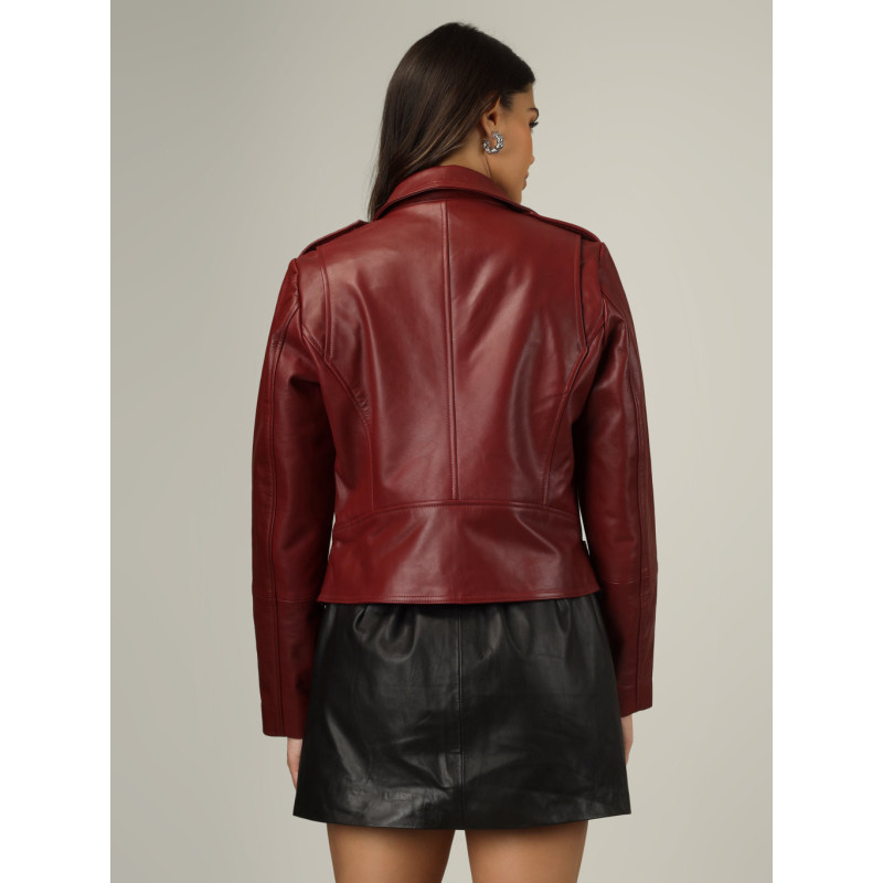 Make a fearless fashion statement with this stunning Wine Luxe Moto Leather jacket. Crafted from genuine leather, it combines edgy design with timeless elegance. Featuring a classic asymmetrical zip, belted waist, and sharp lapel collar, this jacket embodies confidence and sophistication. Whether paired with jeans for a casual chic look or over a dress for a daring night out, this piece ensures you’ll stand out wherever you go.