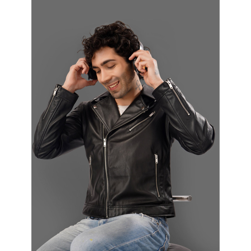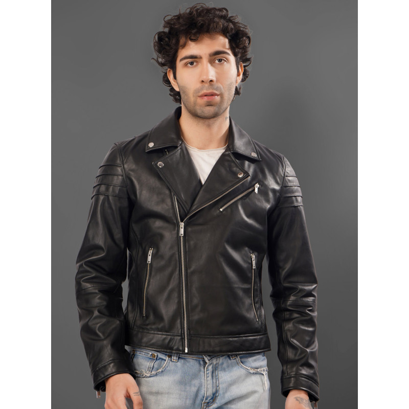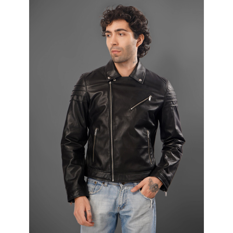 This Jacket is a classic Black Leather Biker Jacket with a sleek, modern look. Leather jackets are warm and windproof; aside from their use by motorcyclists, they are also worn for protection during rugged outdoor activities. Most leather jackets are now worn as everyday clothing. The leather jacket is a very hard-wearing garment, and the more worn it gets, the more attractive it becomes.
