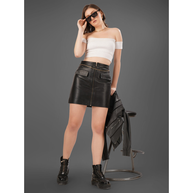 Command attention in the Urban Rebel Leather Skirt, a sleek mini designed for the modern trendsetter. Made from premium black leather with a front-zip closure and utility-inspired flap pockets, it blends edgy street style with sophistication. Pair it with combat boots for a fearless vibe or dress it up with heels for a night out. Versatile, confident, and undeniably bold—this skirt is your go-to for making a statement.